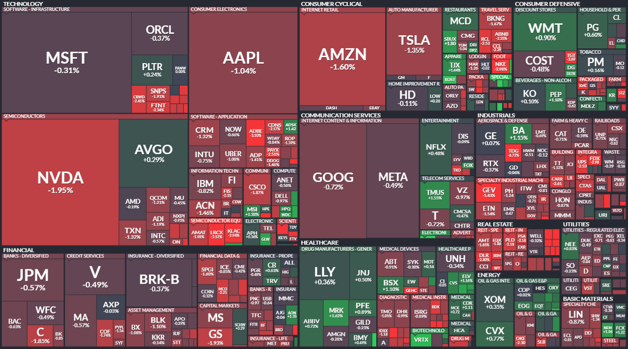 30년 만기 미국 국채 수익률이 5%에 육박하면서 금리 민감주인 기술주들에 압박을 가했다. 모든 대형주가 하락세를 보였으며, 엔비디아는 3월 이후 가장 긴 하락세를 기록했다.