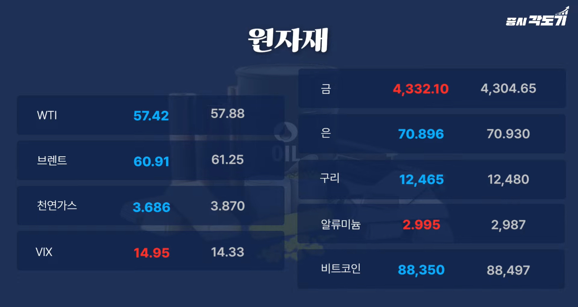 에너지 시장에서는 서부텍사스산원유(WTI)가 미국 내 휘발유 재고 급증 소식에 하락하며 3년 연속 하락세를 이어갔다. 글로벌 경기 둔화 우려와 재고 축적이 맞물리며 유가 하방 압력이 지속되는 모습이다.