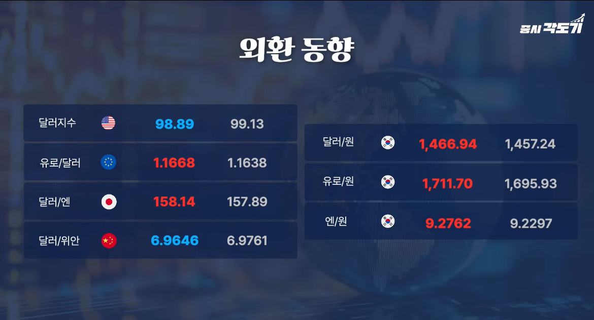외환시장에서는 원·달러 환율이 1,470원에 근접하며 약세 흐름을 이어갔다. 일본의 재정 건전성에 대한 우려가 부각되면서 엔화가 약세를 보였고, 원화는 엔화와 동조하는 형태로 달러 대비 약세 압력을 받았다.